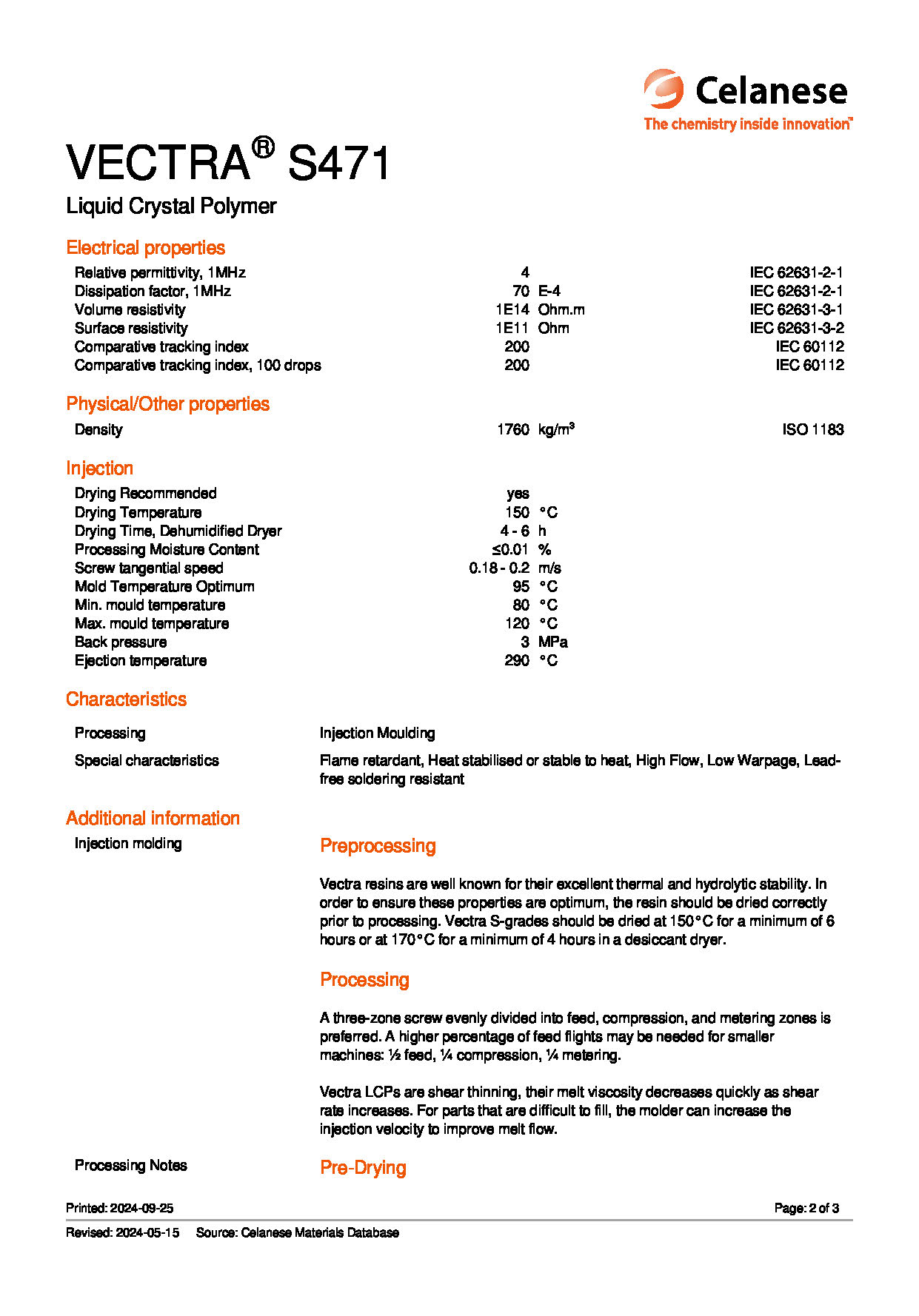 High flow, High Heat resistance, Low Warpage, for Thick Walled (>0.2mm) or thin (< 0.2mm)& Thick Walled combination parts. Chemical abbreviation according to ISO 1043-1 : LCP Inherently flame retardant UL-Listing V-0 in natural and black at 0.4mm thickness per UL 94 flame testing. Relative-Temperature-Index (RTI) according to UL 746B: electricals 130°C, mechanicals 130°C. UL = Underwriters Laboratories (USA)